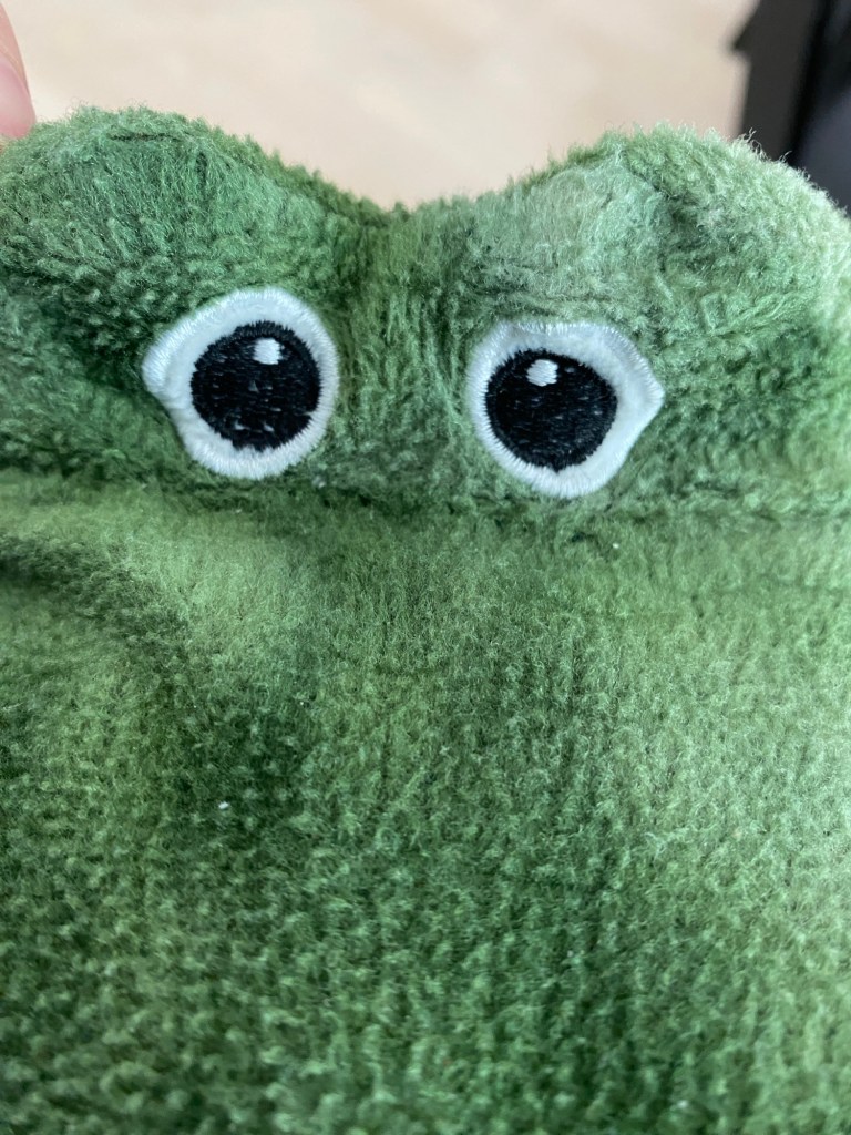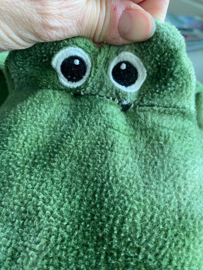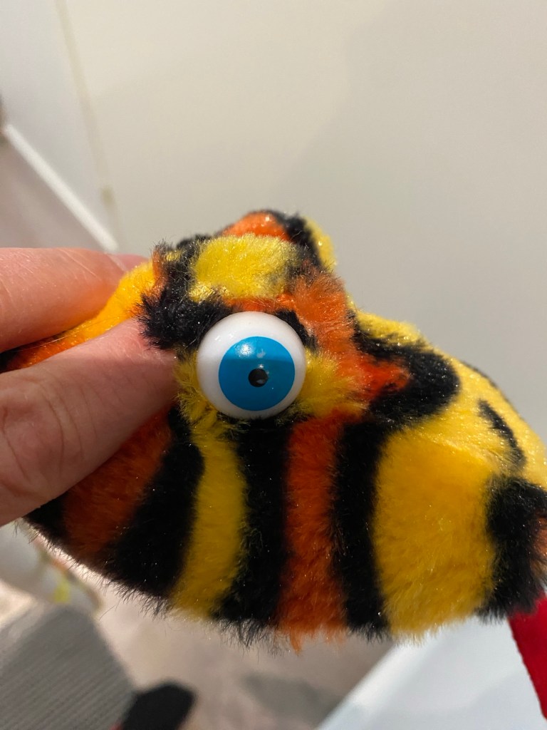 Samaa sitten tänään valitettiin pehmokrokotiilistä, että silmän alla on reikä.