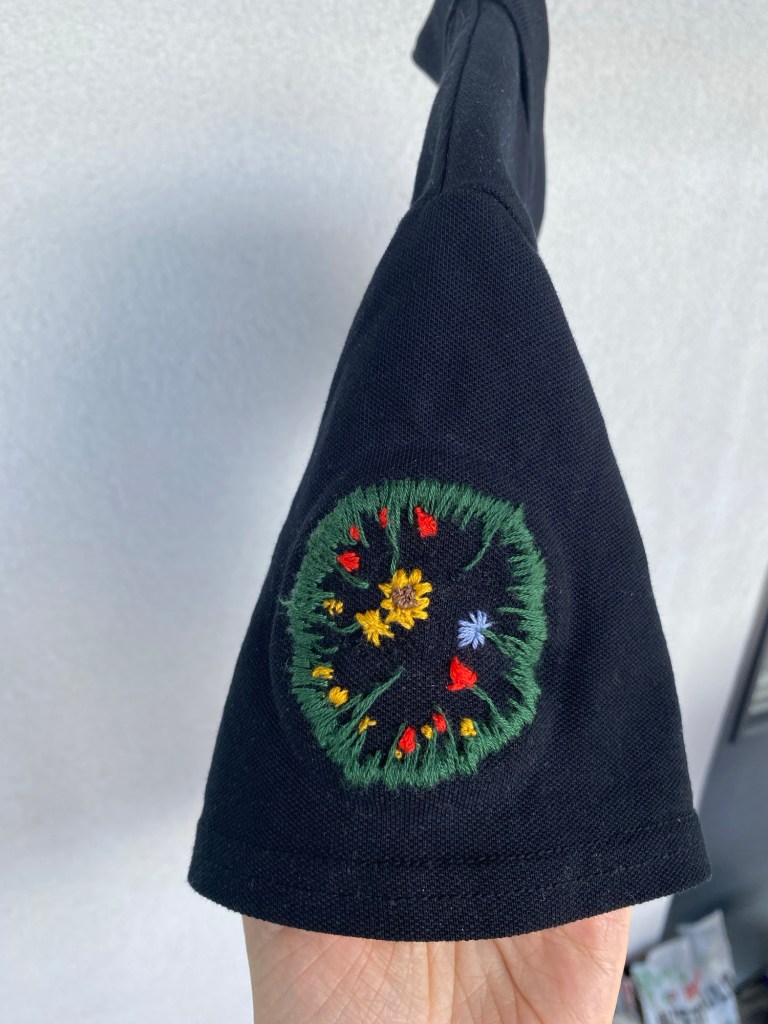 Vielä isompi työ on ollut ison kuvallisen logon poistaminen ja peittäminen brodeerauksella käsin. paitojen materiaali on yleensä niin ohut ja brodeeraus on usein rikkonut alla olevat langat, että pelkkä logot irtileikkaaminen ei riitä. Pieniä reikiä tulee melkein väistämättä ja muutenkin kankaaseen jää jälkeä. Toisaalta paita tulee paljon useammin päälle, kun se on koristeltu kauniiksi.
