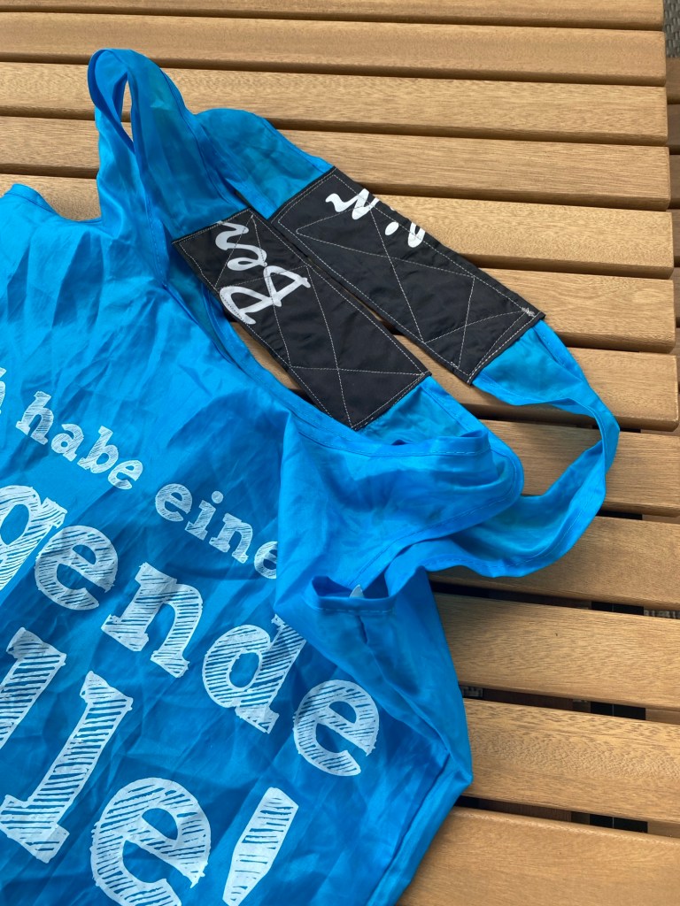 Ja mun tuurilla ei tarvinnut pitkään odottaa, että jokin hajoaisi. Kierrätysmateriaalista tehdyn kantokassin kahvat rikkoutuivat ja kantaminen ei olisi enää onnistunut ainakaan olalla. Onneksi varjon kangas oli tuntumalta aika samanlainen, eli ei kun ompelukone surraamaan. Lopputuloksen näet alla.