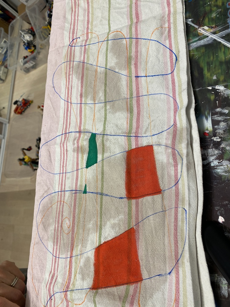 Tässä pyyhkeessä esimerkiksi oli iso rasvatahra eikä sitä tehnyt mieli enää käyttää mihinkään, ärsytti lähinnä joka kerta, kun sitä katsoin. Mutta kynillä kun aloin piirtää, peittyi tahra alle ja se sai taas uuden mahdollisuuden. Ei sillä toki enää viitsis astioita kuivata, mutta moneen se vielä soveltuu.